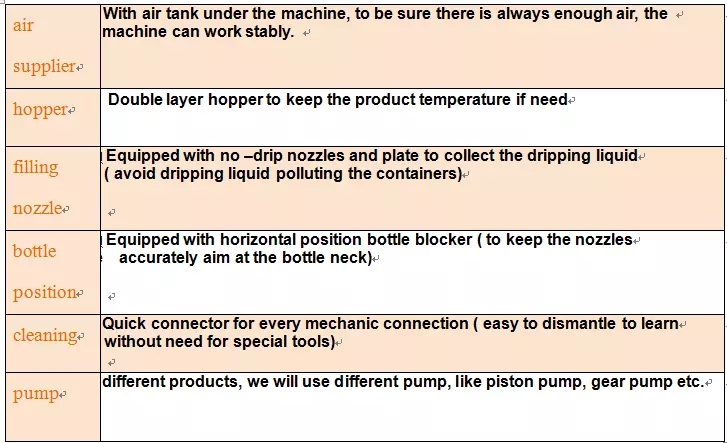 එන්ජින් ඔයිල්, මෝටර් ඔයිල්, සලාද, අත් සේදීමේ ජෙල්, පොල්තෙල්, සෝයා බෝංචි සෝස්, තල, ෂැම්පූ, දියර සබන්, එන්ජින් ඔයිල් වැනි ආහාර කර්මාන්තයේ, රසායනික කර්මාන්තයේ සහ වෙළඳ භාණ්ඩවල සියලුම දුස්ස්රාවිතතාව / ද්රව සඳහා මෙම යන්ත්රය විශේෂයෙන් සකසා ඇත. , තිරිංග තෙල්, ඉවුම් පිහුම් තෙල්, තක්කාලි සෝස්, බීම, අත්යවශ්ය තෙල්, එළවළු තෙල්, මී පැණි, ගම්මිරිස් සෝස්, රටකජු බටර්, යෝගට්, යුෂ, බීම ආදිය. දියර / සෝස් සමඟ සම්බන්ධ වූ සියලුම කොටස් උසස් තත්ත්වයේ මල නොබැඳෙන වානේ වේ. යන්ත්රය පිරවීම සඳහා පිස්ටන් පොම්පය භාවිතා කරයි. ස්ථානීය පොම්පය සකස් කිරීමෙන්, සියලු බෝතල් එක් පිරවුම් යන්ත්රයක, වේගවත් හා ඉහළ නිරවද්යතාවයකින් පුරවා ගත හැකිය.