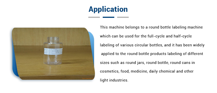 මෙම යන්ත්රය රවුම් බෝතල් ලේබල් කිරීමේ යන්ත්රයකට අයත් වන අතර එය විවිධ චක්රලේඛ බෝතල්වල සම්පූර්ණ චක්රය හා අර්ධ චක්ර ලේබල් කිරීම සඳහා භාවිතා කළ හැකි අතර එය වටකුරු භාජන, වටකුරු බෝතල් වැනි විවිධ ප්රමාණවලින් ලේබල් කරන රවුම් බෝතල් නිෂ්පාදන සඳහා පුළුල් ලෙස යොදා ගෙන ඇත. , රූපලාවණ්ය, ආහාර, medicine ෂධ, දෛනික රසායනික හා වෙනත් සැහැල්ලු කර්මාන්ත වල රවුම් කෑන්.